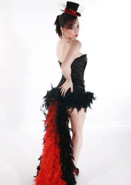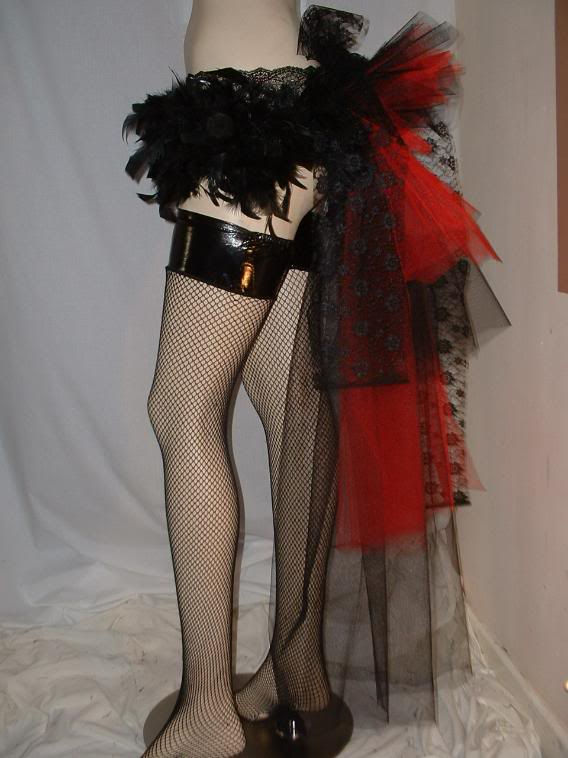 Short Black feather short skirt with attached Black & Red Bustle sizes 6-14